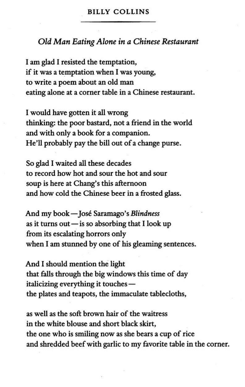 I love this poem so much, and am struck by many things including: (a) how Billy Collins often looks back, comparing what he understands today with how little he understood in youth - eg his poem "The Lanyard" - in which he ruefully recalls how he thought, as a boy, that the lanyard he made for his mother in summer camp was gesture enough to make them "even" for all she had given him ...and (b) how, when struck by a gleaming sentence, the man in this poem would look up from his book. I believe the looking up is caused by that amazing sensation, when confronted by something exquisite, to find another soul to see and appreciate the exquisite thing too. It's interesting to me how it never feels enough to look at it solo - how the true pleasure comes in sharing the wonder. And that then is a counterpoint to the contentment the man in the poem finds in being alone. (In fact, one of the many things I love about The Quiet Life is being able to share amazing things (like this poem) with you all.
